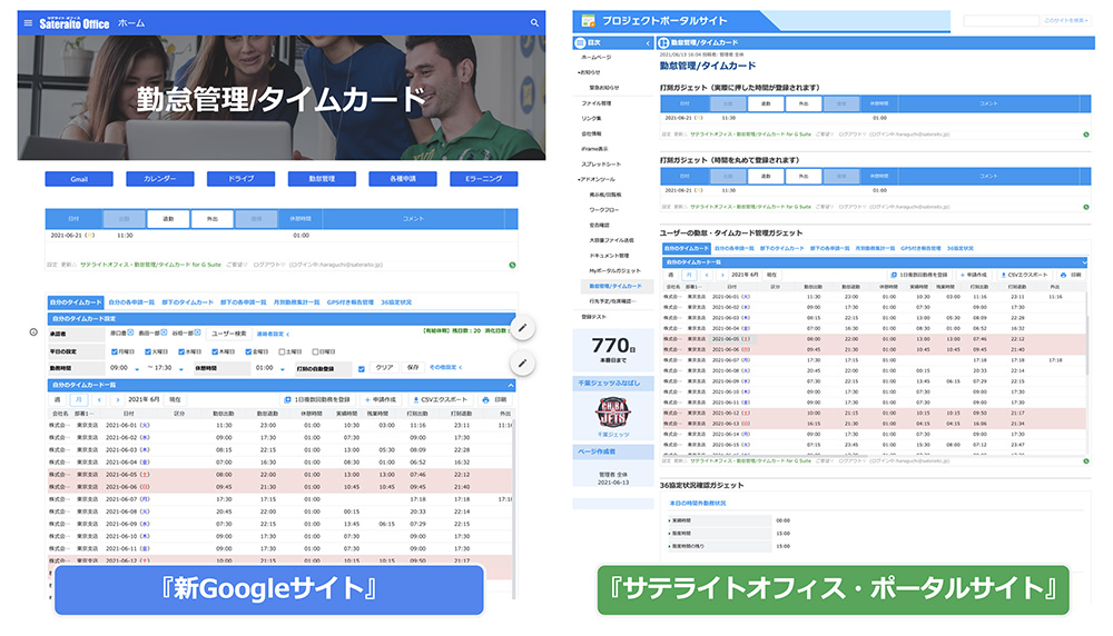 『サテライトオフィス・勤怠管理/タイムカード for Google Workspace』とは、Google Workspaceとシームレスに動作するクラウド環境の勤怠管理/タイムカードの機能です。Googleサイト上にアドオンで実現することが可能です。Google サイト のガジェットとして公開していますので、企業ポータル内の色々な部分に導入・表示可能です。(例、企業ポータルトップページに『出社・退社』ボタンを設置する!など)さらに、Windows版勤怠管理/タイムカードアプリのWindows等にインストールいただくことでWindows等デスクトップから打刻することも可能です。また、フェリカ系カードによるタイムカード打刻/GPS情報取得も可能です!