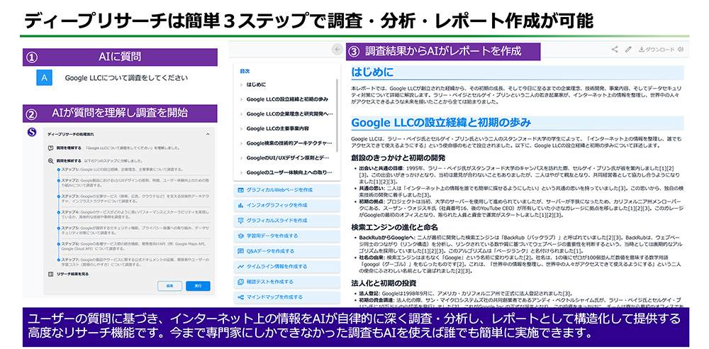 AIの調査内容から、Word/PPT/PDF/HTML/TEXTファイルにまとめ、ダウンロードが可能 |